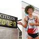 タイムを指さす服部=福岡国際マラソン – 時事通信